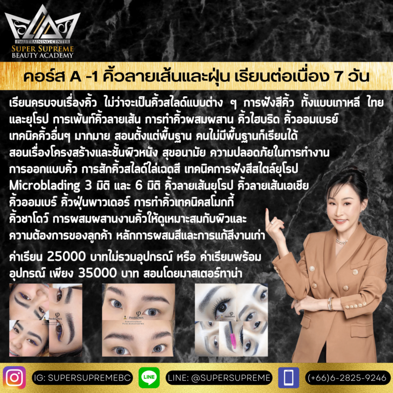 - สอนงานคิ้วผสม เป็นการผสมผสานงานคิ้ว 2 ชนิดขึ้นไป มาผสมผสานกัน ให้ดูเหมาะสมกับผิวและความต้องการของลูกค้า เช่น คิ้วไฮบริด หัวลายเส้นหางสไลด์ Microblading and mix shading คิ้วคอมบาย คิ้วฟิวชั่น ฯลฯ