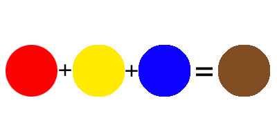 สีแดง + สีเหลือง + สีน้ำเงิน อย่างละไม่เท่ากัน จะได้สีน้ำตาล