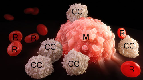 M, macrophage: CC, cancer cell: R, red blood cell