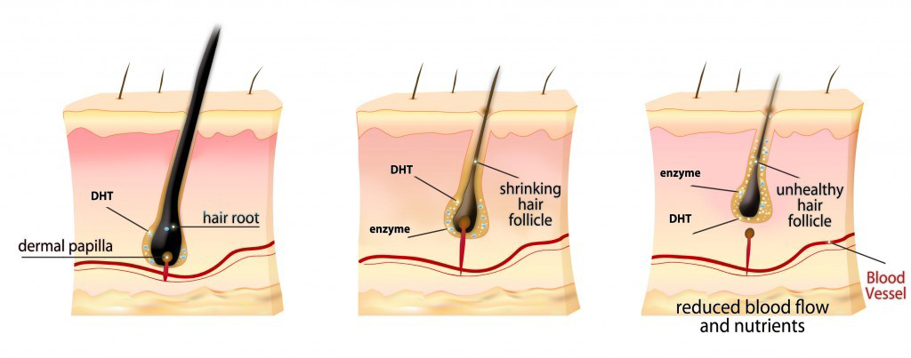 ฮอร์โมน กลุ่มแอนโดรเจน (androgen) เป็นตัวสำคัญที่กำหนดการงอกและการร่วงของเส้นผมในรูปแบบของชายและหญิงซึ่ง ถ่ายทอดมาทางพันธุกรรม ฮอร์โมนแอนโดรเจนตัวหนึ่งที่ชื่อเทสโทสเตอโรน (testosterone) และสารที่เกี่ยวข้องในกระบวนการ คือไดไฮโดรเทสโทสเตอโรน (dihydrotestosterone, DHT) เป็นปัจจัยควบคุมหลัก:- เทสโทสเตอโรนคือปัจจัยควบคุมหลักในการงอกของหนวดเครา ขนรักแร้ และขนบริเวณอวัยวะเพศ